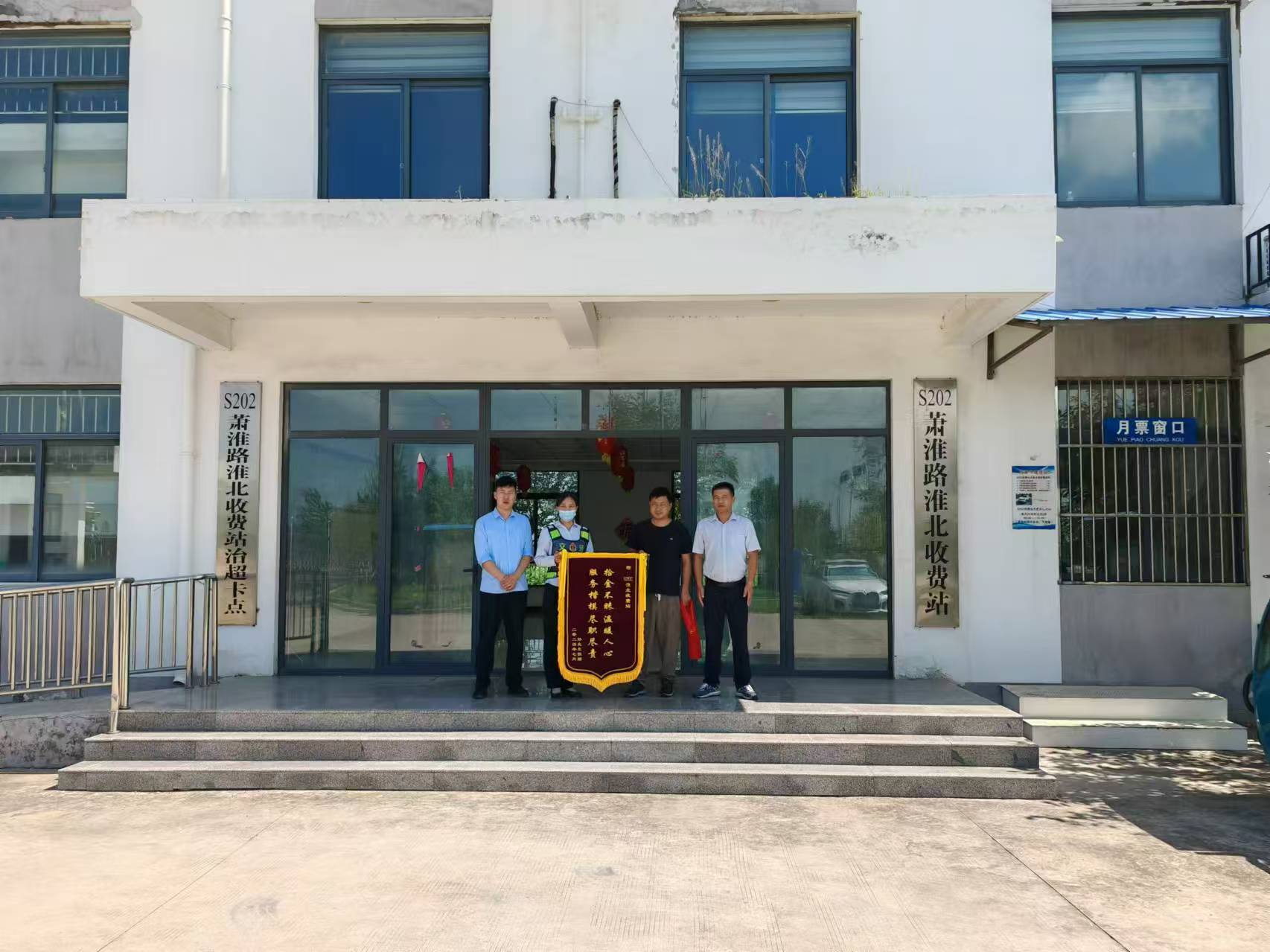 “真的谢谢你们,没接到你们电话之前,我已经和家里的人找了好久了,一直不知道掉哪里了。感谢你们拾金不昧、乐于助人,送上小小锦旗,聊表谢意!”7月25日,在S202淮北收费站,失主孙先生送上锦旗一个劲地向工作人员道谢。
