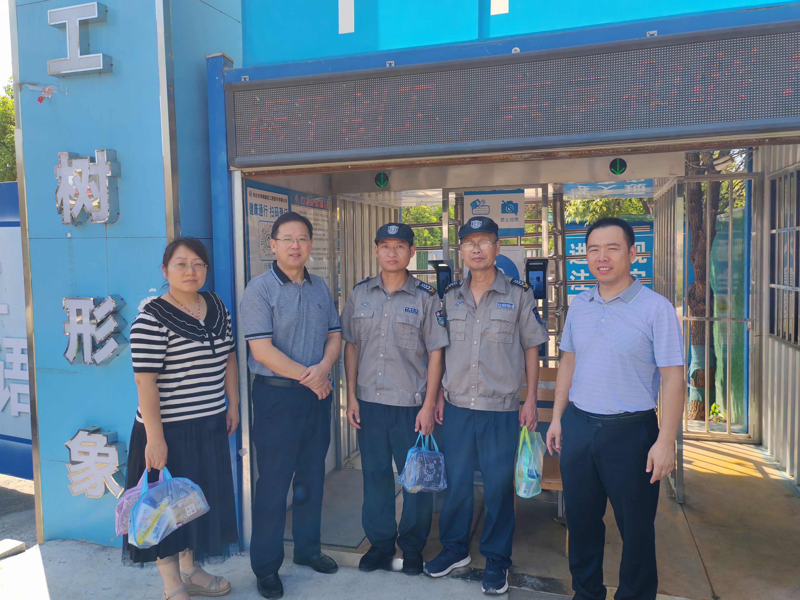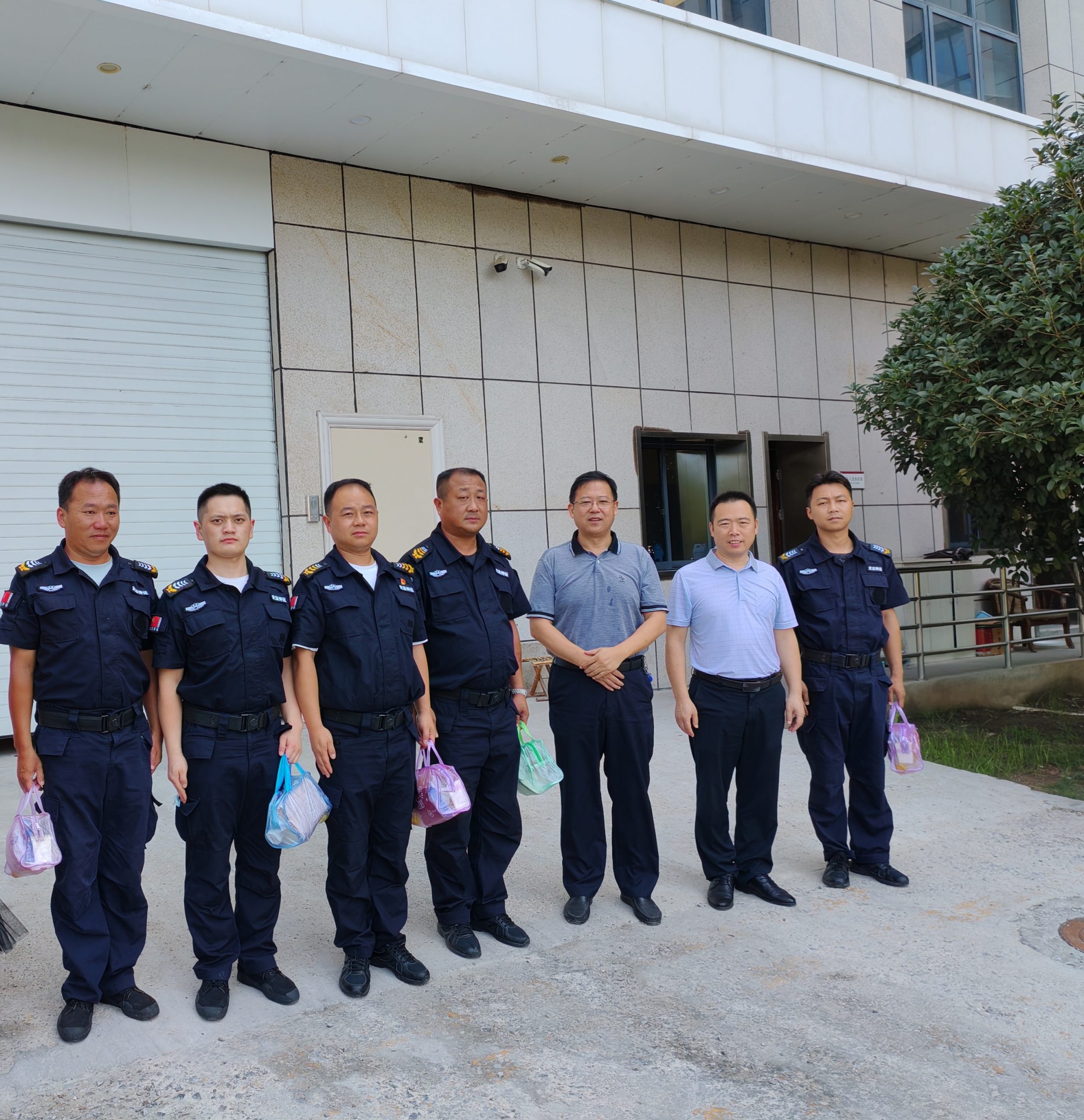 近日,随着夏季高温的持续,淮北大地骄阳似火,酷暑难耐。7月31日上午,为表达对坚守在一线的押运和保安队员的深切关怀,集团公司党委委员、副总经理张立哲同志一行分别前往保安公司押运徽商银行驻点、人防电厂2号门驻点,为在高温下辛勤工作的队员们送去了香皂、洗发水、花露水等慰问品,并送上一份清凉与关爱。