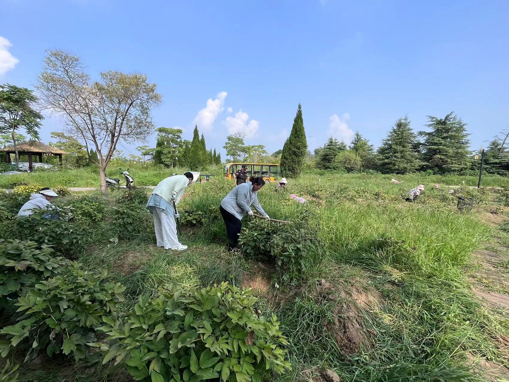 活动中,党员同志们和运营人员、机关办公室人员齐上阵,手持镰刀、锄头等除草工具,主动认领除草修剪区域,铲除牡丹花周边的杂草、枯树枝等杂物,积极投入到对牡丹园的养护工作中去,争当“绿水青山”的护卫者,尽管烈日当头,酷暑难耐,却丝毫未消减大家志愿服务的热情和保护环境的坚定决心。